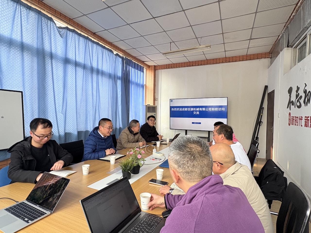 【本网消息】(智能工程学院 辛光供稿)12月17日,成都百源机械有限公司总经理、成都市钣金行业协会副秘书长黄勇,公司技术(质量)中心负责人杨廷兵等一行五人莅临智能工程学院,与院长王真文、副院长孙安民、海渡机器人产业学院副院长辛光、机器人岗位负责人聂小芮等开展座谈交流。