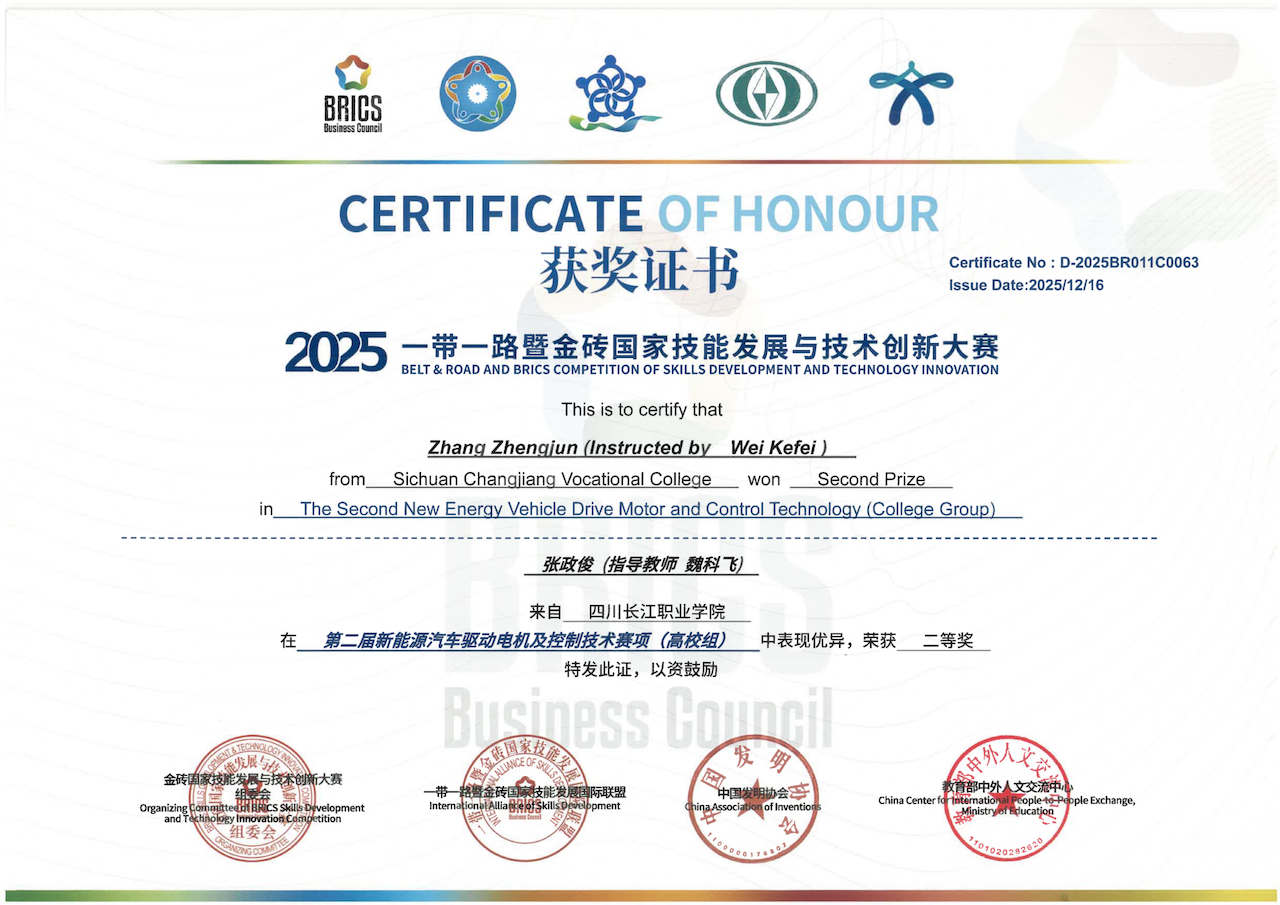【本网消息】(智能工程学院 魏科飞供稿)12月12日,2025一带一路暨金砖国家技能发展与技术创新大赛,第二届新能源汽车驱动电机及控制技术赛项(高校组),在安徽工业机械学校举行。智能工程学院智能汽车系张政俊、彭钰伟、郑子奇三位同学同学,在与102所院校208支队伍角逐中,再获佳绩,分别斩获二等奖、三等奖和优秀奖的佳绩,并为学校带来优秀组织奖的荣誉。