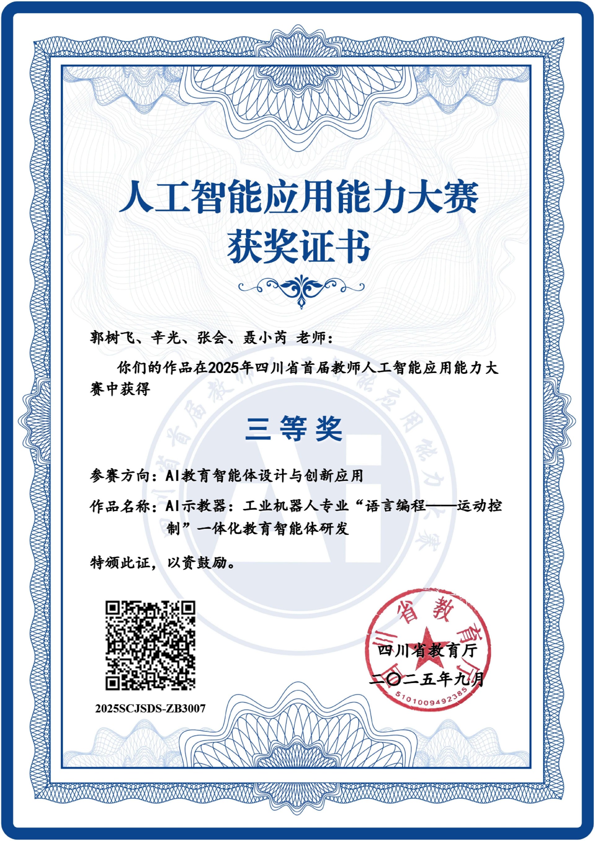【本网消息】(质量部童秋 供稿)近日,四川省教育厅公布了首届教师人工智能创新应用能力大赛获奖名单,我校教师获二等奖2项,三等奖2项。