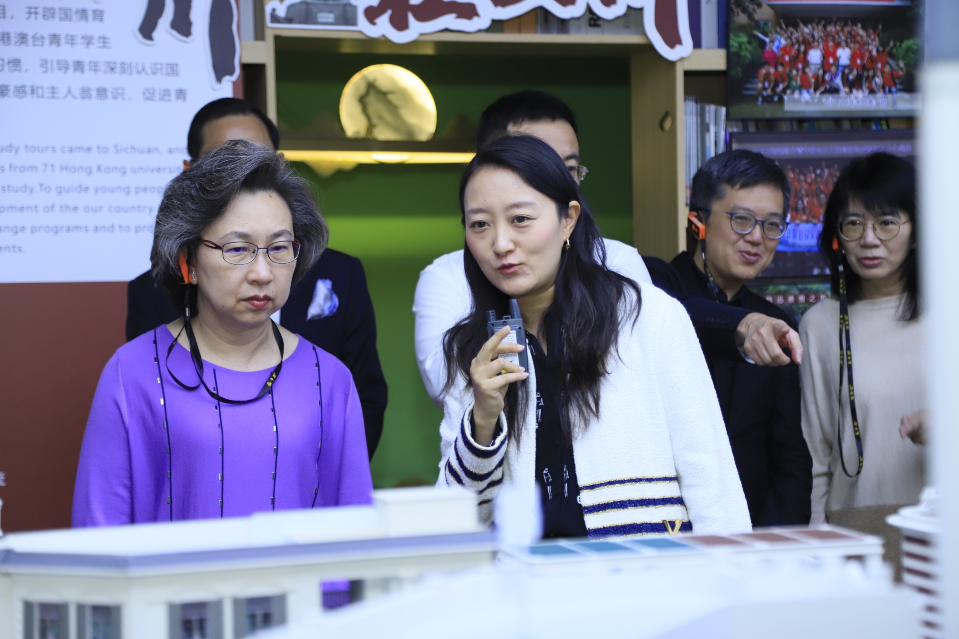 在沙盘前,学校理事韩戌向研修班一行汇报了“蓉港荟”项目建设情况,她表示,“蓉港荟”项目将以川港经济建设为核心,发挥香港“超级联系人”作用,同步打造成都与香港尖沙咀双基地,推进川港文化长廊、香港经济及人文艺术展、共享总部三大空间建设,发挥香港故事宣传、民心相通交流、职业教育实践、南向出海窗口四大功能,致力打造成为川港青年交流、教育合作、双创孵化、开放联动的重要载体。