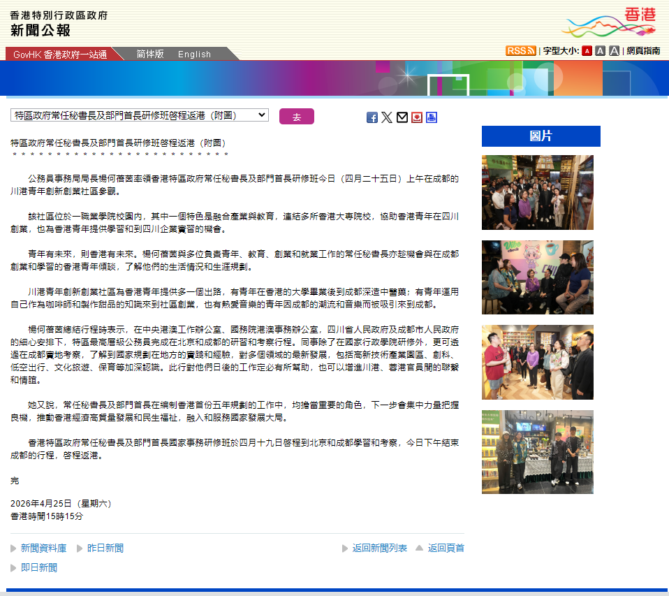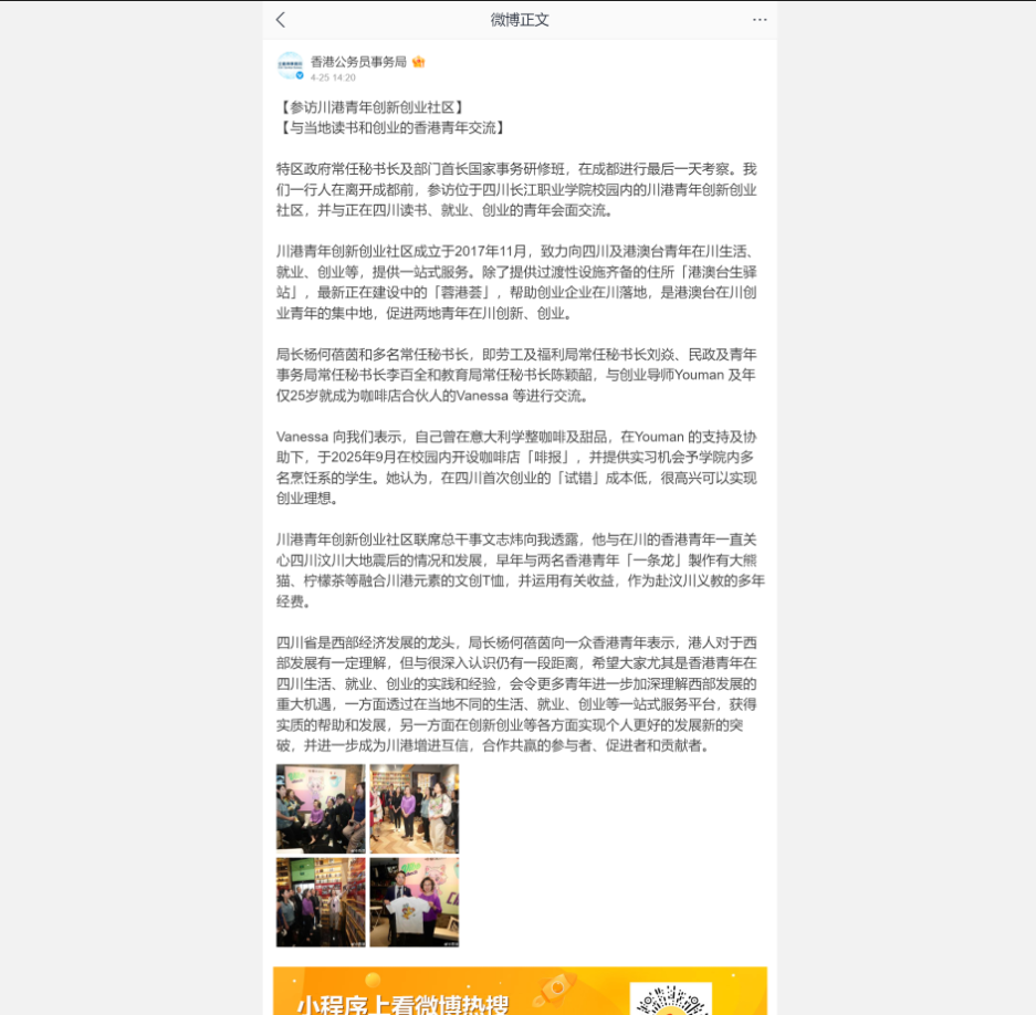 考察结束后,香港公务员事务局微博及时更新新闻报道,对社区和学校在深化川港教育合作、支持青年创新创业以及推动产教融合方面取得的成效进行高度评价。