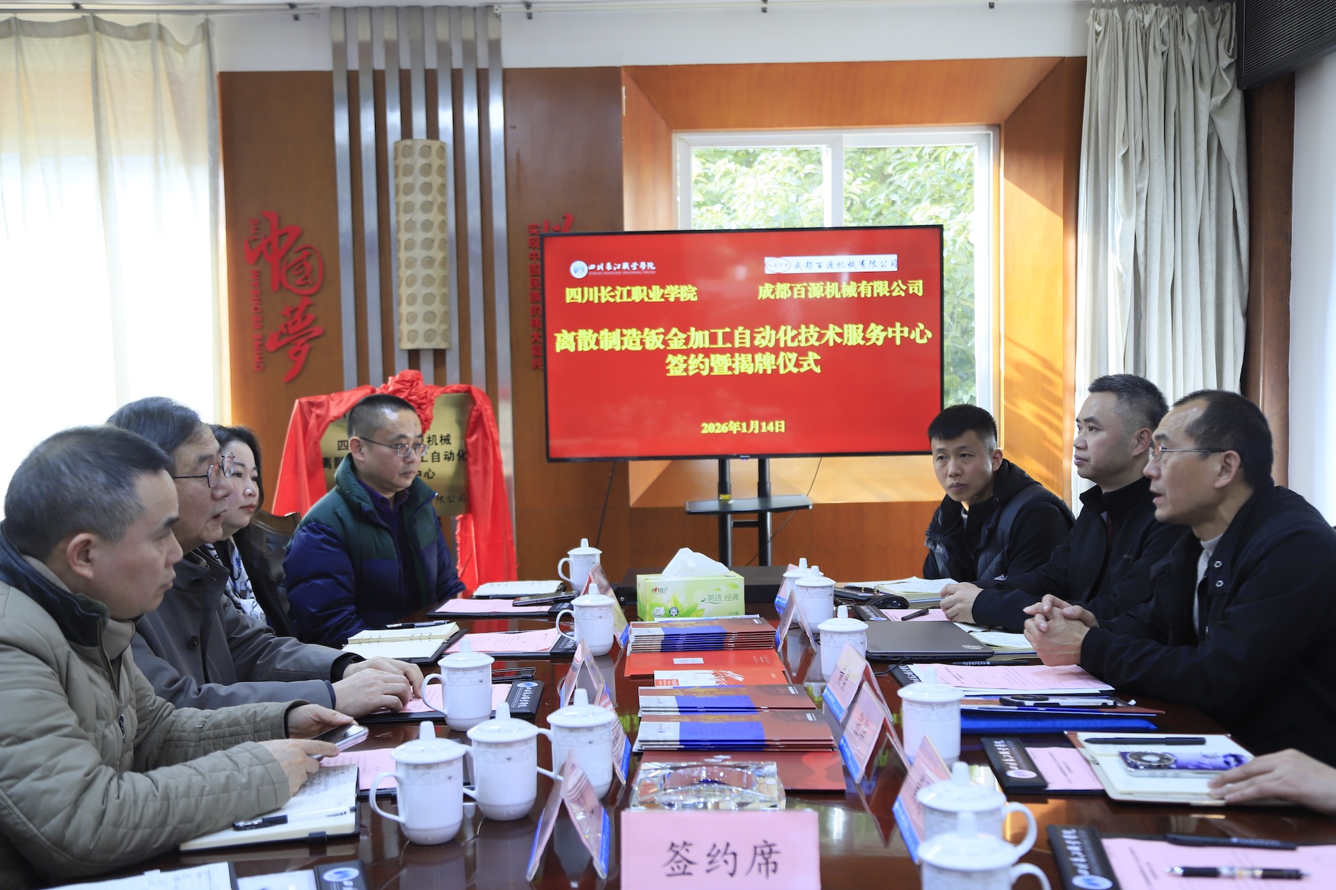 【本网消息】(智能工程学院 黄中民供稿)2026年1月14日,四川长江职业学院与成都百源机械有限公司共建的“长江—百源离散制造钣金加工自动化技术服务中心”签约暨揭牌仪式在四川长江职业学院顺利举行。成都百源机械有限公司总经理黄勇、副总经理张华、杨延兵,工程部主管唐东,四川长江职业学院常务副校长耿兵、智能工程学院院长王真文、副院长孙安民、张会,海渡机器人产业学院副院长辛光,以及相关专业教师代表共同出席本次活动。仪式由智能工程学院副院长张会主持。
