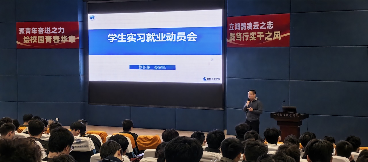 学校教务部副部长兼产教融合办公室主任孙安民围绕岗位实习相关工作展开讲解,重点解读了实习政策文件,明确了总体要求。他鼓励同学们打破地域局限,不局限于川渝地区,主动放眼长江三角洲、珠江三角洲等产业发达区域,勇敢对接大公司、优质企业。同时,他强调同学们要正视角色转换,摒弃浮躁心态,以严谨态度对待实习,并介绍了学院“培养、实习、就业”一体化衔接模式,引导同学们树立“实习即就业”的理念。