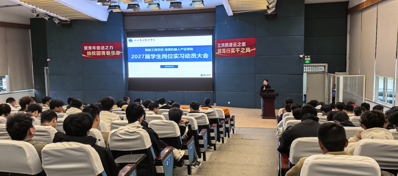 【本网消息】(智能工程学院赵文宣供稿)为扎实推进2027届学生岗位实习工作,明确实习要求、规范实习流程,助力学生实现从校园到职场的角色转变,3月30日,智能工程学院海渡机器人产业学院2027届学生实习就业动员大会在老学术报告厅顺利召开。学校教务部副部长兼产教融合办公室主任孙安民、智能工程学院院长王真文、海渡机器人产业学院副院长辛光、学工办主任助理严志童,海渡机器人产业学院全体专任老师、辅导员,以及2024级机器人应用工程师岗位班全体学生参加本次大会,大会由严志童老师主持。