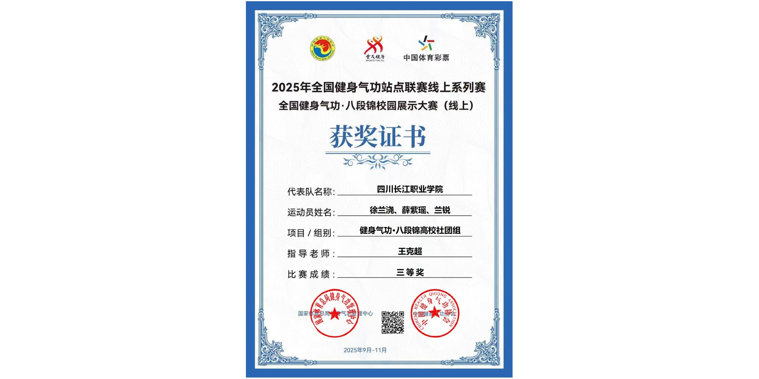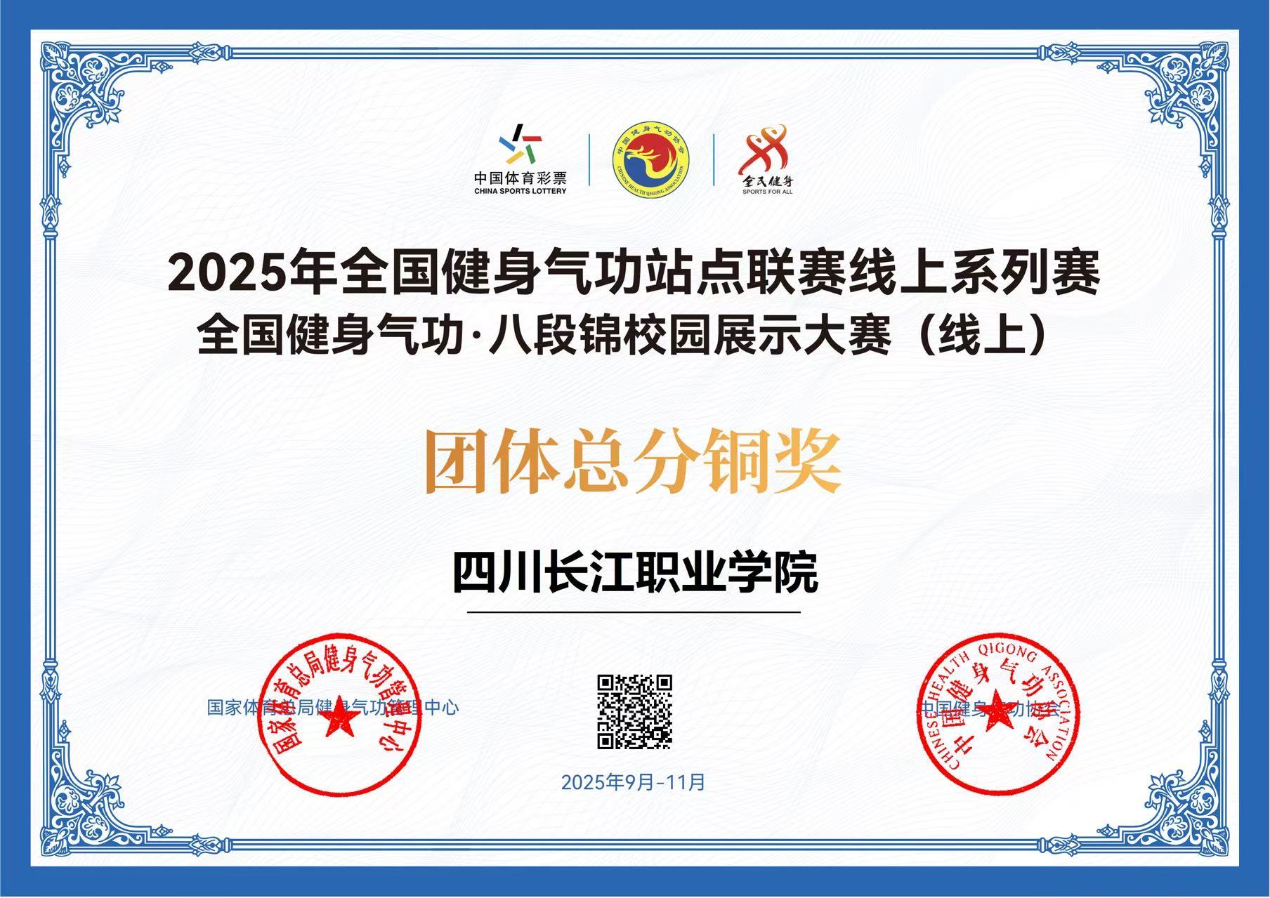【本网消息】(智慧城市与低空应用学院 王克超供稿)在近期圆满落幕的2025年全国健身气功站点联赛线上系列赛暨全国健身气功·八段锦校园展示大赛(线上)中,四川长江职业学院体育工作部选派的三支参赛队伍凭借扎实的功底和稳定的发挥,最终斩获二等奖1项、三等奖2项的佳绩,并荣获团体总分铜奖,充分展现了学校学子良好的精神风貌和体育素养。