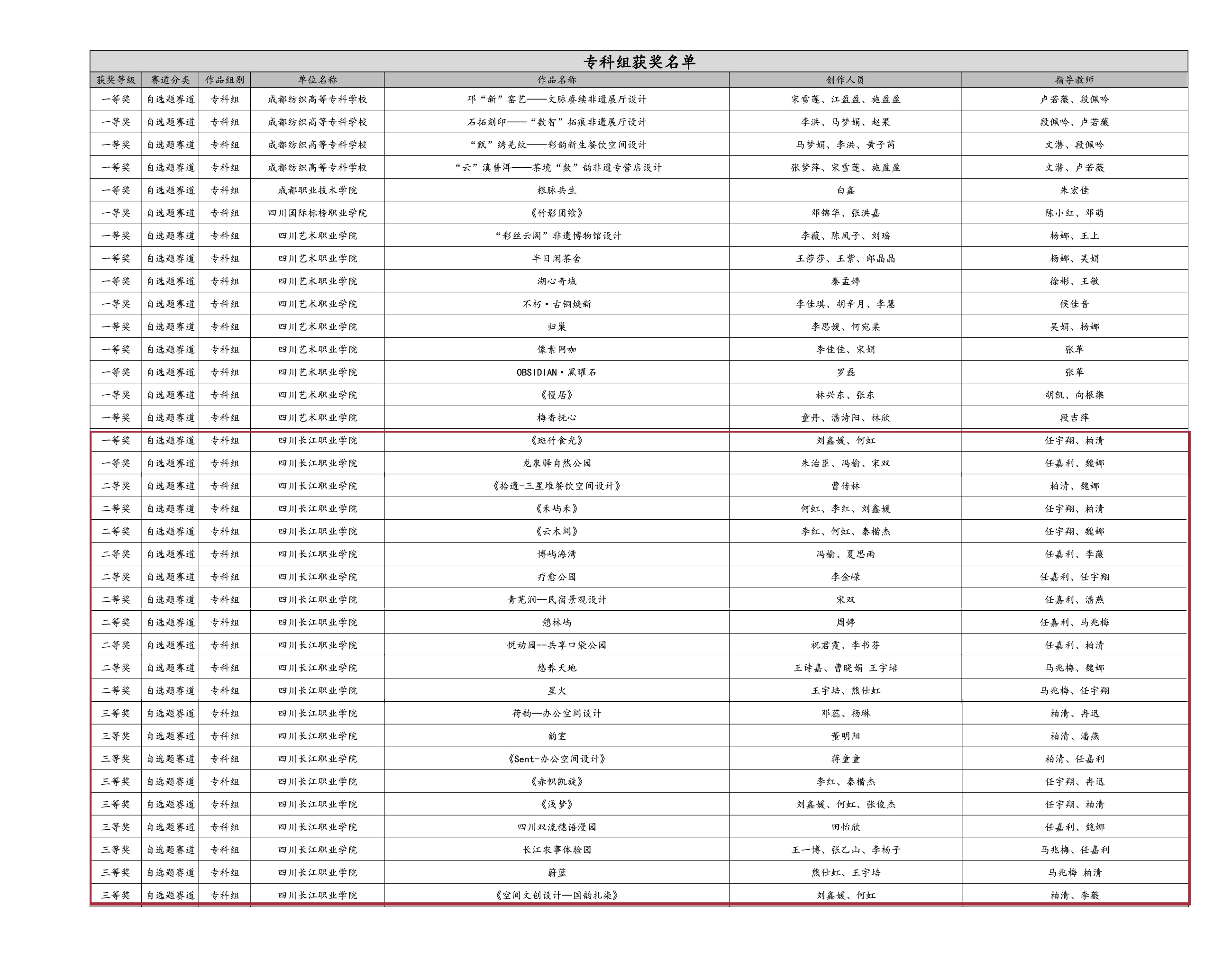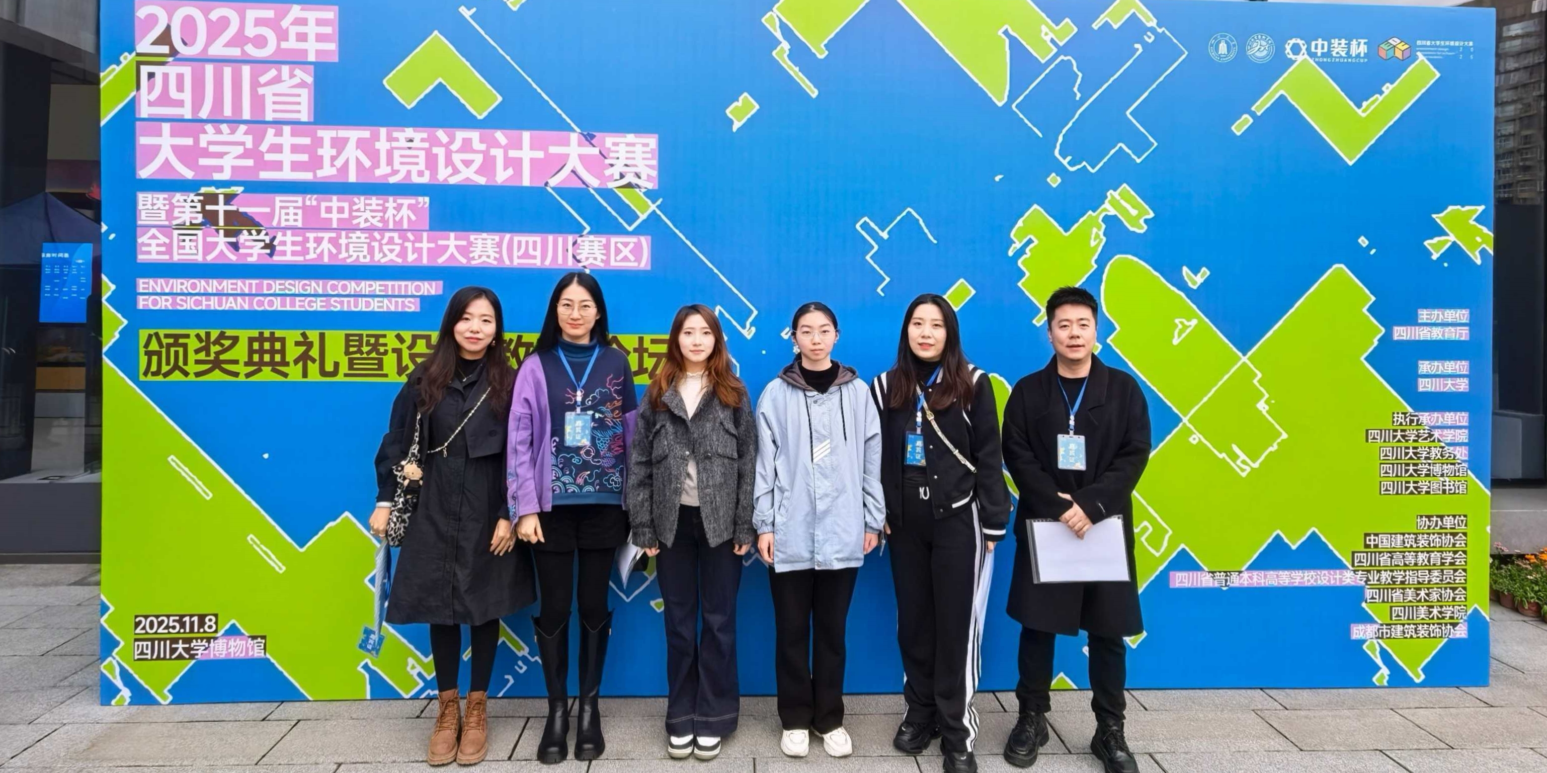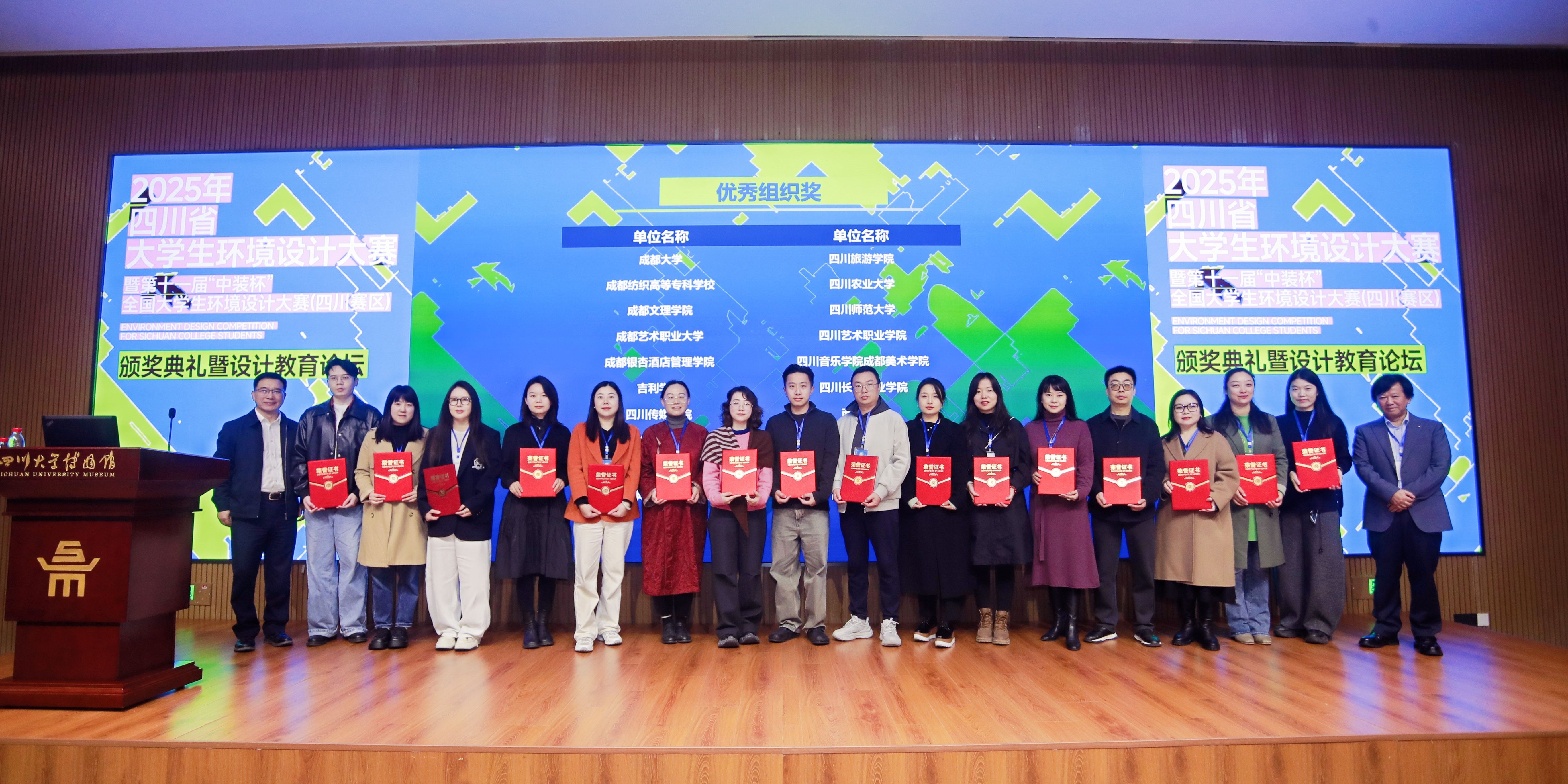 【本网消息】(智慧城市与低空应用学院 任嘉利、魏娜、柏清、任宇翔供稿)近日,由四川省教育厅主办、四川大学承办的2025年四川省大学生环境设计大赛暨第十一届“中装杯”全国大学生环境设计大赛颁奖典礼于11月8日在四川大学博物馆隆重举行。我校智慧城市与低空应用学院环境艺术设计专业、建筑室内设计专业学子再创佳绩,凭借出色的创意设计与扎实的专业功底,在全省众多优秀参赛队伍中脱颖而出,荣获一等奖2项、二等奖10项、三等奖9项的好成绩,建筑室内设计专业群教师任宇翔、柏清、任嘉利、魏娜获评优秀指导教师,四川长江职业学院获评优秀组织奖。