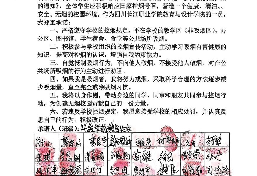 此次全覆盖的主题教育与承诺书签订,不仅强化了学生的健康意识和规则意识,也展现了学院学子积极向上的精神风貌和强烈的集体责任感;学院将以此次活动为契机,持续深化健康教育,携手全体学生共同筑牢无烟校园防线,为建设文明、和谐、健康的校园环境贡献力量。