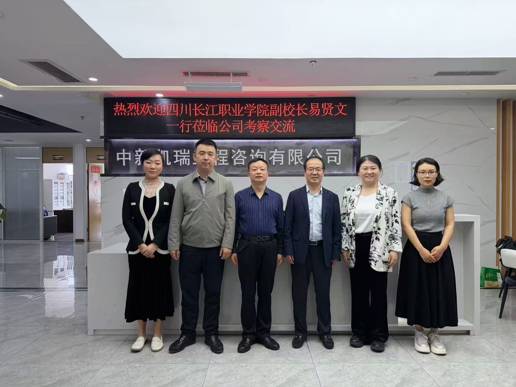 【本网消息】(智慧城市与低空应用学院 朱长红供稿) 为响应国家“访企拓岗促就业”部署,4月23日,我校易贤文副校长、智慧城市与低空应用学院刘婷副院长、学生发展处陈文主任及教师朱长红一行赴中新凯瑞工程咨询有限公司交流。董事长张庆九、副总经理张静、人事经理杨国热情接待。