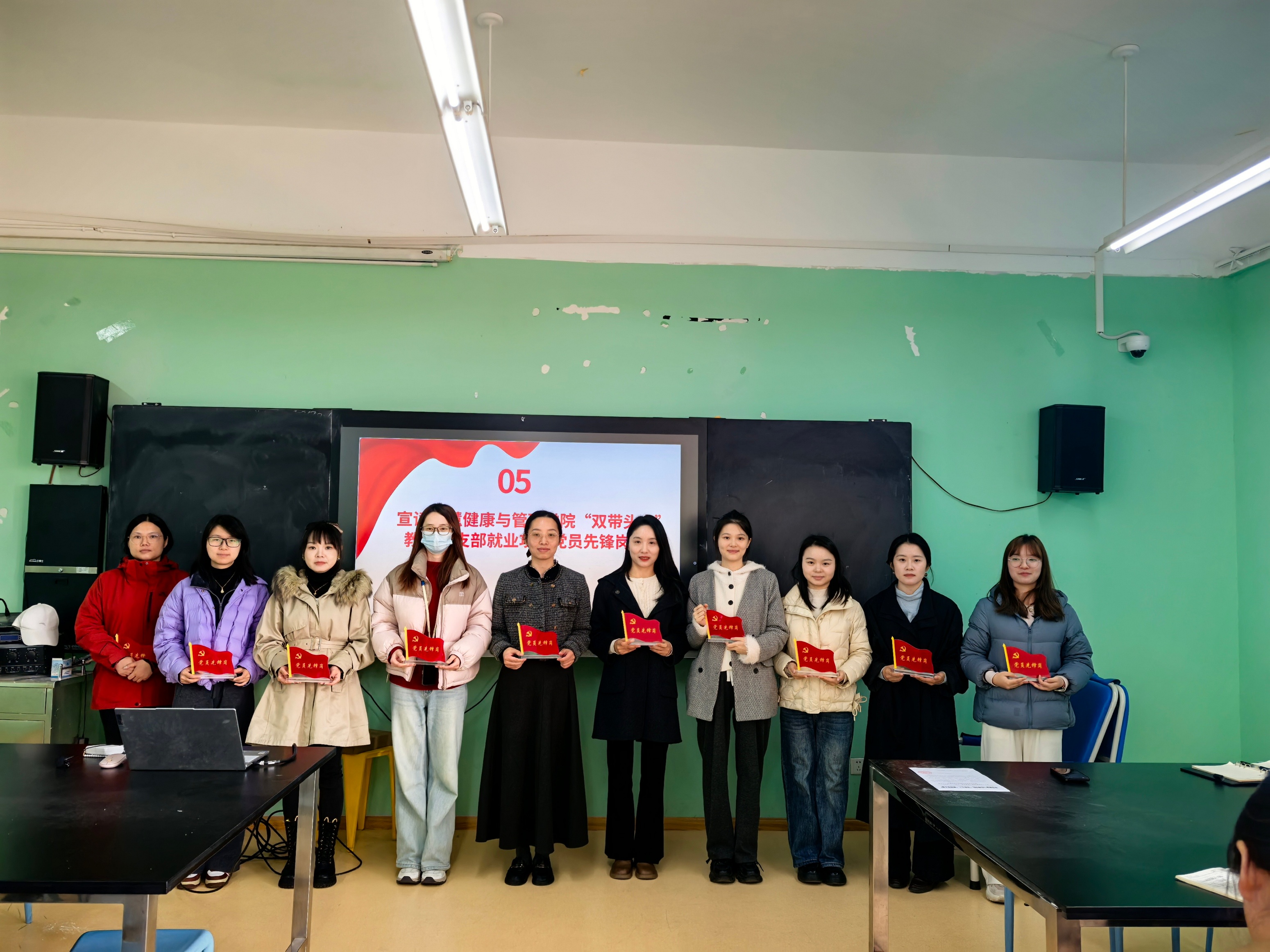 最后,张院长宣读 “双带头人” 教师党支部就业攻坚先锋队伍成立通知并授旗,以及宣读就业攻坚党员先锋岗名单并授牌,以党建引领凝聚就业攻坚合力,充分发挥基层党组织战斗堡垒作用和党员先锋模范作用。