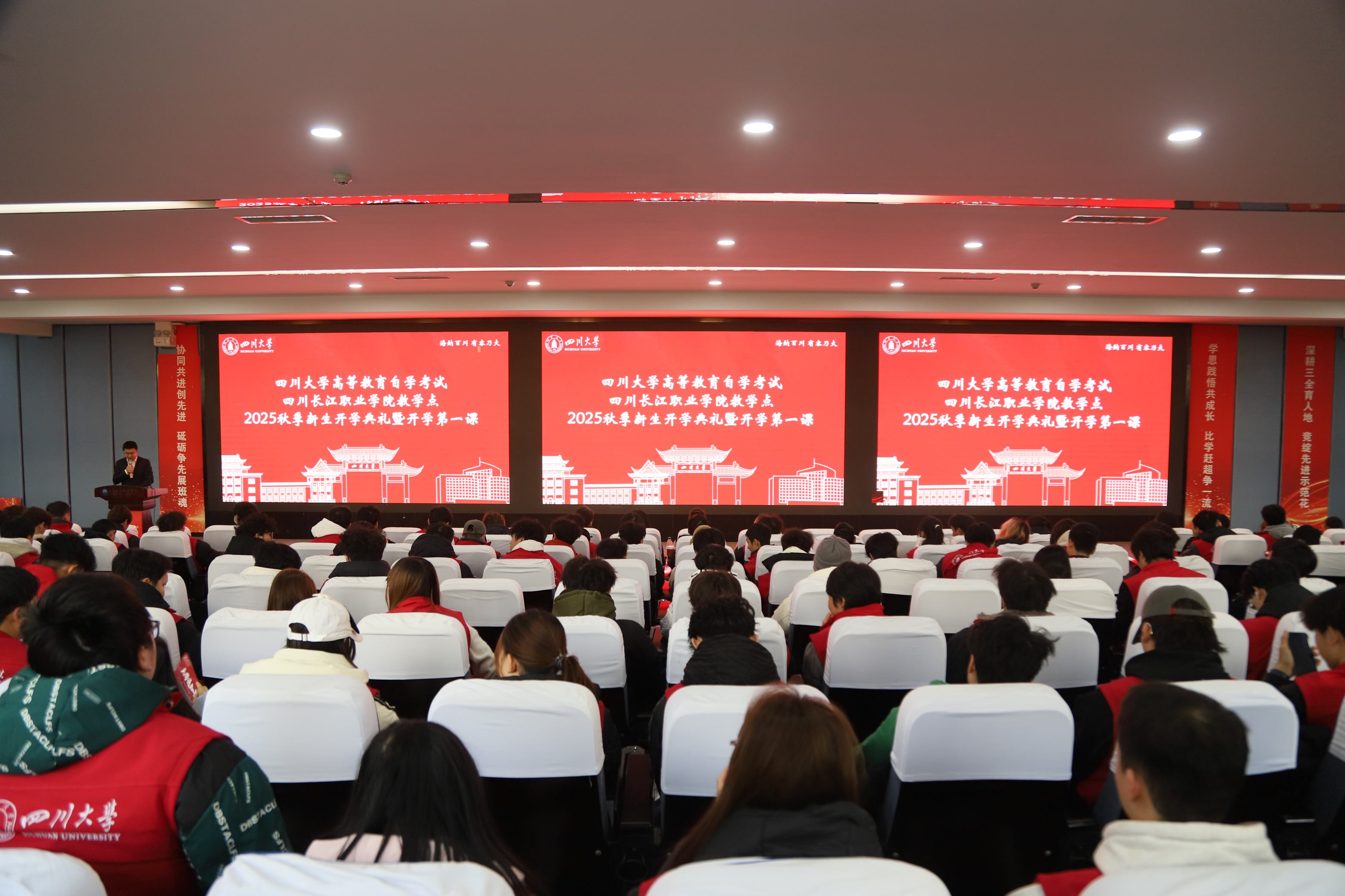 【本网消息】(高峰持续进修学院郑娟供稿)12月15日,四川大学高等教育自学考试四川长江职业学院教学点2025级秋季新生开学典礼在学校新学术报告厅隆重举行。四川大学教育培训部学历教育办公室主任吴静汶、蒲彦辰老师,四川长江职业学院副校长潘刚教授,高峰持续进修学院学生发展服务事业部郑娟部长等嘉宾出席典礼,与教学点全体辅导员及438名2025级自考专升本新生共同见证这一新征程的启航。