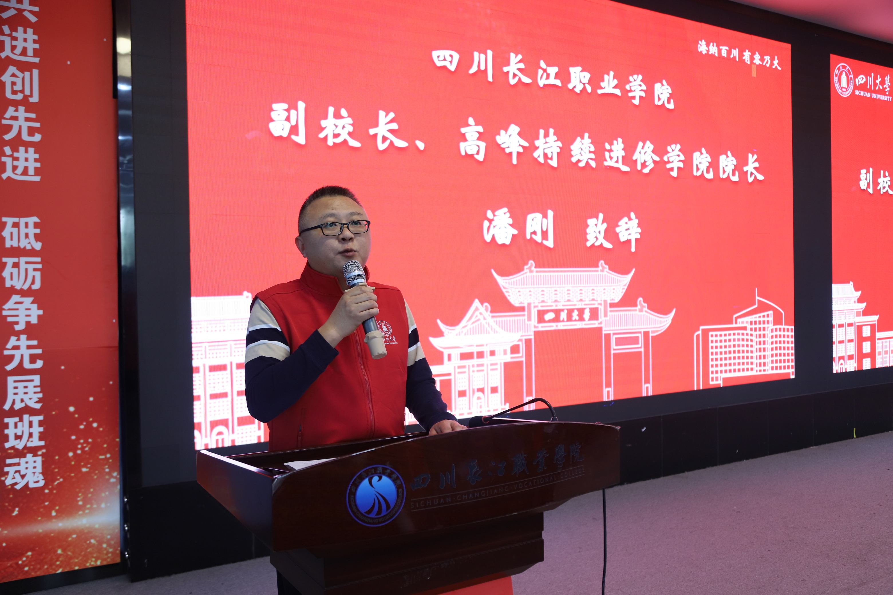 典礼在庄严的国歌声中拉开序幕。四川长江职业学院副校长潘刚教授首先致辞,他回顾了学校自2011年承办自考专升本项目以来,始终秉承“以学生为本”的办学宗旨,以严谨的态度和多元化的教学模式,为历届学子搭建了优质的学历提升平台。他特别指出,项目已成功将传统面授教学模式转型升级为“AI+教育”的智慧教育新生态,打破了传统助学固化的学习模式,旨在满足学生个性化、泛在化的学习需求,学院将全力为同学们的学习之路保驾护航。